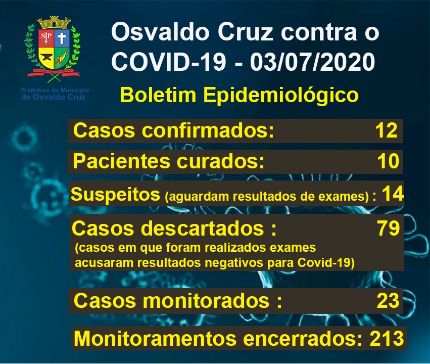 A Vigilância Epidemiológica de Osvaldo Cruz emitiu novo Boletim Informativo na tarde desta sexta-feira (03) sobre a situação de casos do novo coronavírus (Covid-19) no município.