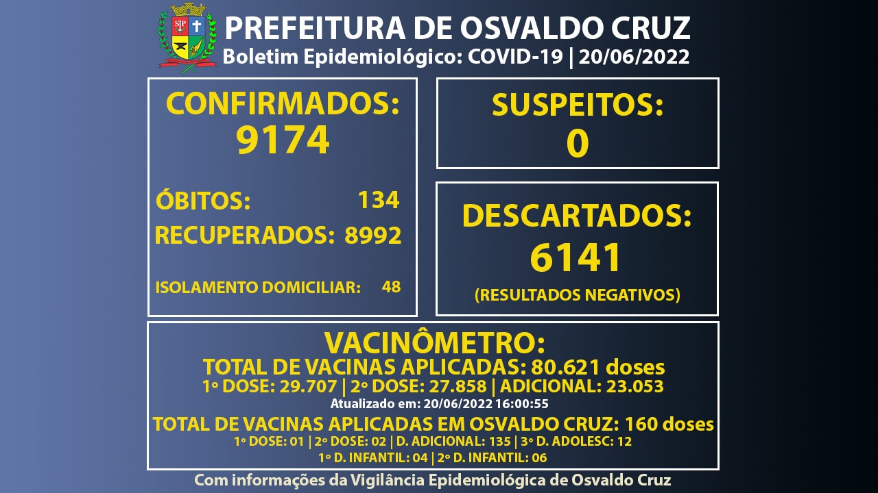 A Vigilância Epidemiológica de Osvaldo Cruz divulgou nesta segunda-feira (20), os dados atualizados da pandemia no município.