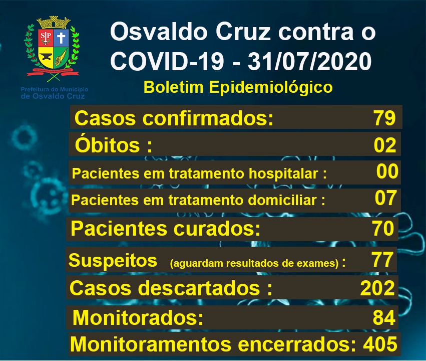 Os pacientes já recuperados da doença somam 70, e sete pessoas ainda estão em tratamento e isolamento domiciliar em Osvaldo Cruz. Outras 77 pessoas aguardam resultados de exames e há um paciente que permanece internado e também aguarda resultado de exame. Ao todo, 202 casos foram descartados. Ainda segundo o boletim, 84 pessoas seguem monitoradas e 405 monitoramentos já foram encerrados no município. Dois óbitos são registrados em Osvaldo Cruz.