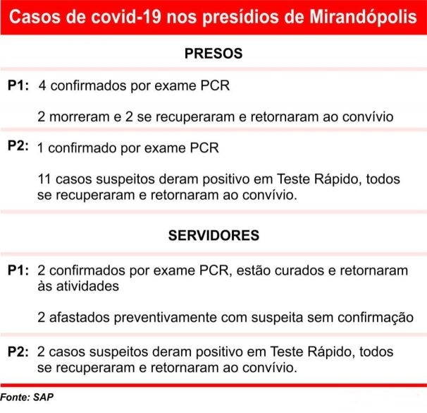 A SAP (Secretaria da Administração Penitenciária), informa que desde o início da pandemia, foram registrados 20 casos positivos de covid-19 nos presídios instalados em Mirandópolis, que juntas, abrigam população de 4.716 sentenciados, incluindo a ala do regime semiaberto da P1. Dois sentenciados que cumpriam pena nessa unidade morreram.