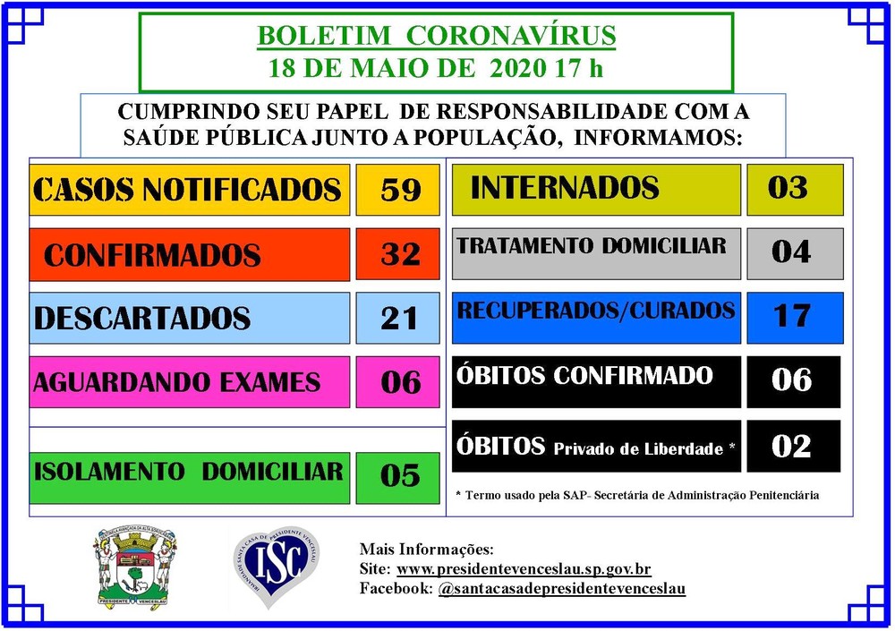 A Prefeitura de Presidente Venceslau divulgou mais uma morte por Covid-19 nesta segunda-feira (18). No boletim oficial, esse óbito consta ser um detento.