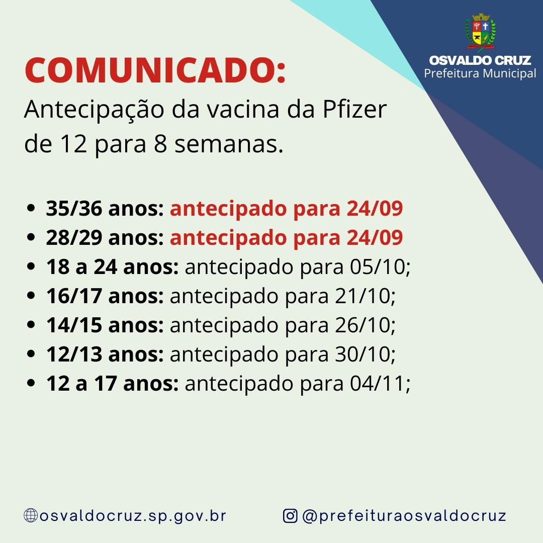 Confira o calendário de antecipação da segunda dose da vacina da Pfzer em Osvaldo Cruz: