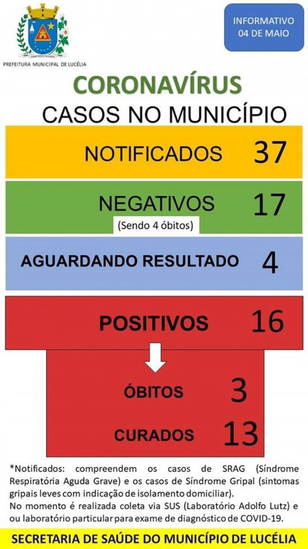 O município de Lucélia tem 16 casos positivos nesta segunda-feira (4). Em comparação com o boletim informativo anterior, no dia 30 abril, mais três confirmações foram somadas.