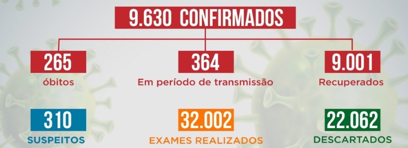 O boletim epidemiológico atualizado pela Secretaria Municipal de Saúde, às 15h30 desta segunda-feira, (10), aponta que o número oficial de contaminados em período de transmissão, pulou de 274 na sexta-feira, (07), para 364, nesta segunda-feira, levando-se em conta outros 111 novos casos positivos e 21 pacientes declarados curados do vírus.