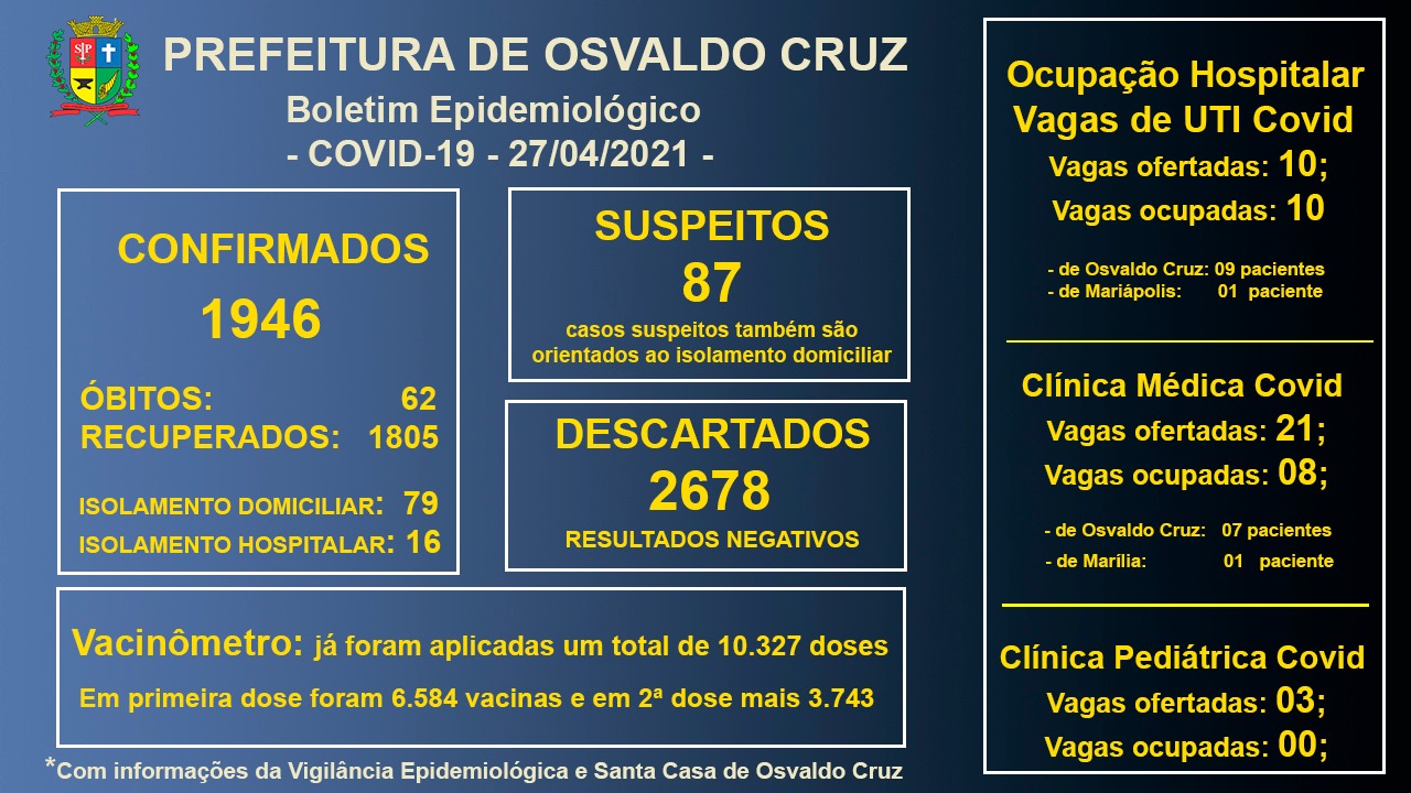 A Santa Casa de Osvaldo Cruz informou no final da tarde desta terça-feira (27) que os leitos de UTI-Covid permaneciam com 100% de ocupação. Das 10 vagas oferecidas, nove pacientes internados são de Osvaldo Cruz e um de Mariápolis.
