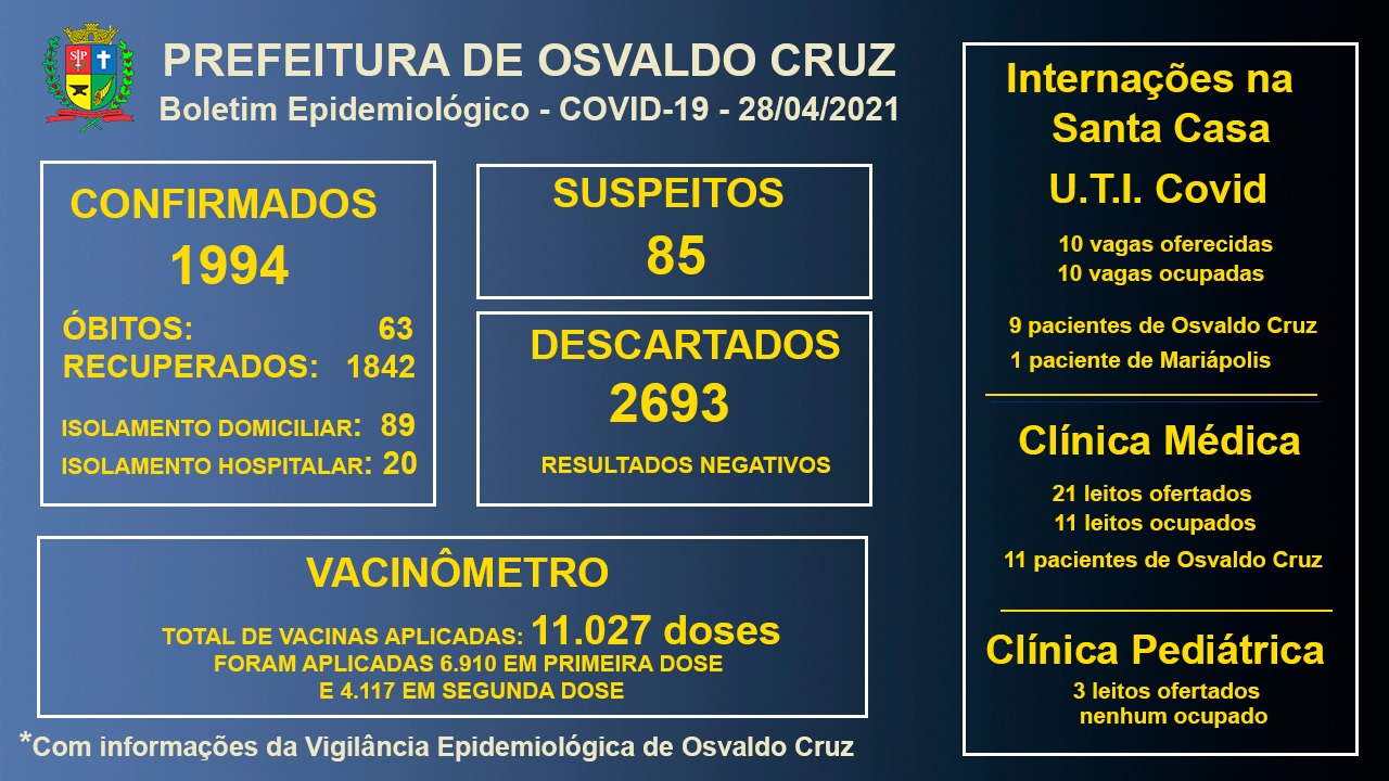 No último boletim informativo sobre a Covid-19 divulgado nesta quinta-feira (29) pela Vigilância Epidemiológica de Osvaldo Cruz, o município registrava 1.994 casos positivos do novo coronavírus desde o início da pandemia com 1.842 pacientes curados.