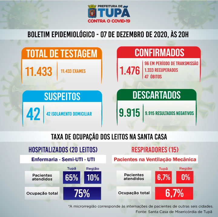 Com esses dados, a Prefeitura já realizou um total de 11.433 exames desde o início da pandemia, com 9.915 resultados negativos e 1.476 casos positivos, sendo 96 ainda em período de transmissão. Tupã conta ainda com 42 casos suspeitos que estão aguardando resultado. Até o momento, 1.333 pacientes já se recuperaram da doença em Tupã.