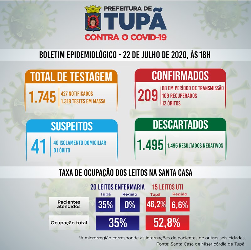 Outras 3 pessoas que contraíram a doença foram consideradas recuperadas da doença. Até o momento, Tupã já realizou 1.745 exames realizados, sendo 427 casos notificados e 1.318 testes em massa. Deste total, 1.495 exames tiveram resultado negativo. Tupã conta atualmente com mais 209 casos confirmados da doença, sendo 88 em período de transmissão, 12 óbitos e 109 pacientes recuperados.