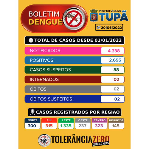 O Departamento de Entomologia e Endemias da Secretaria Municipal de Saúde informa que, do início do ano até esta segunda-feira (20), 4.338 casos suspeitos de dengue foram notificados, sendo 2.655 positivos. Nas últimas 24 horas, foram registrados apenas 9 novos casos positivos.