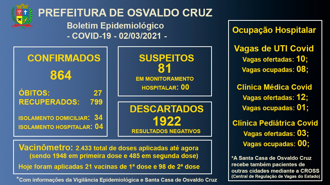 A Prefeitura de Osvaldo Cruz, através da Vigilância Epidemiológica, divulgou Boletim Informativo sobre o novo Coronavírus no final da tarde desta terça-feira (01), que mostra que a cidade registra 864 casos positivos de Covid-19 desde o início da pandemia.