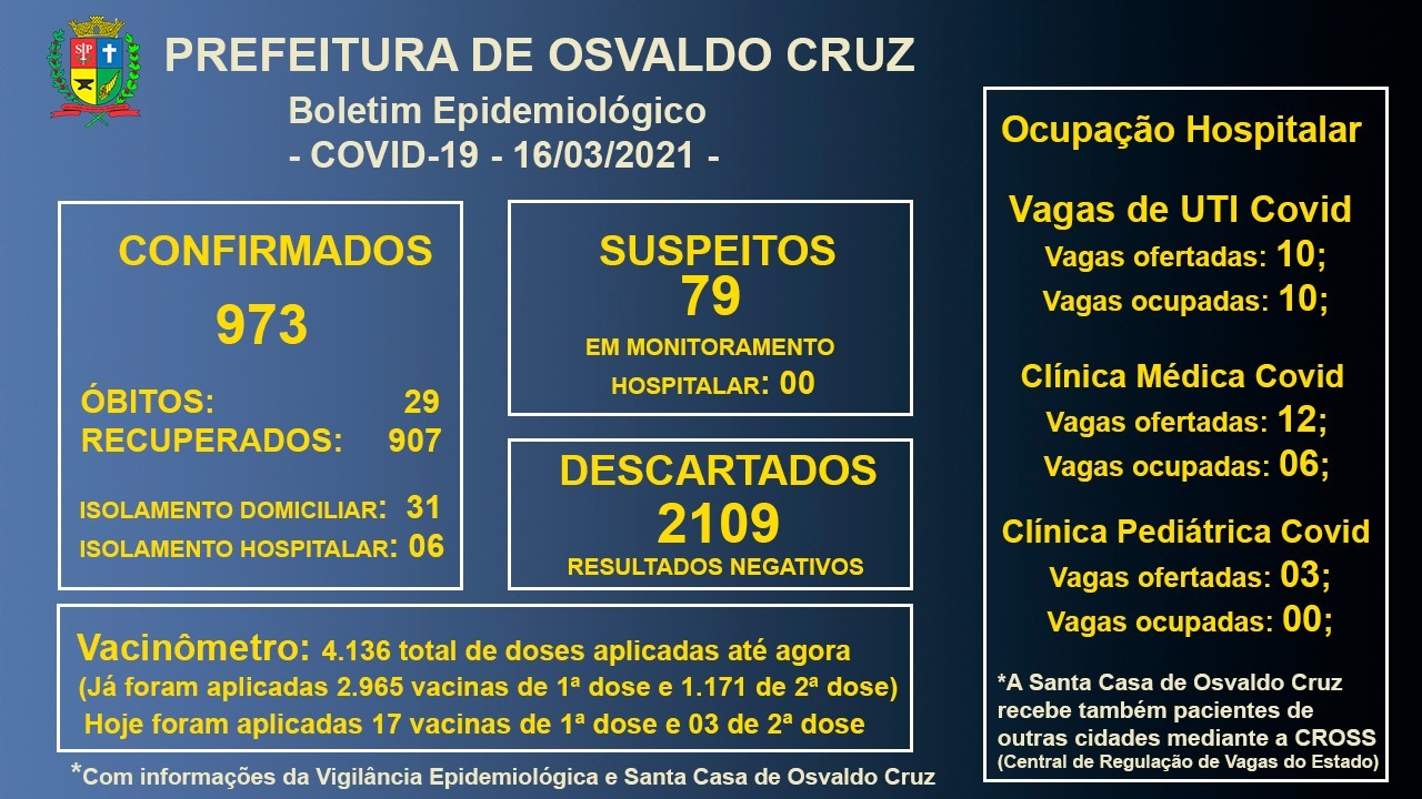 Dos 10 leitos de UTI (Unidade de Terapia Intensiva) de Covid-19 da Santa Casa de Osvaldo Cruz, todos estavam ocupados até esta terça-feira (16). Já com relação aos leitos clínicos para Covid-19, dos 12 ofertados, seis estão ocupados.