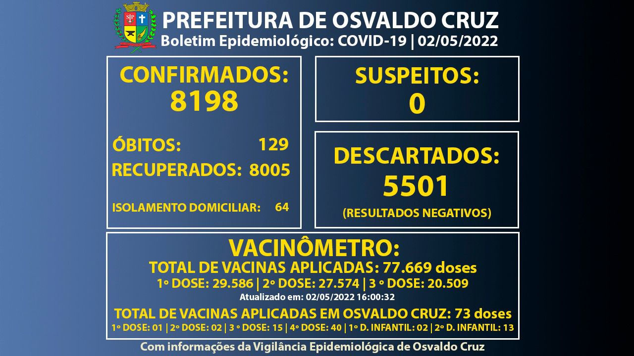 Segundo informações do Boletim Epidemiológico, Osvaldo Cruz confirmou 22 casos e chegou a 8.198 positivos da doença. Estavam em fase de transmissão 64 pessoas, todas em isolamento domiciliar.