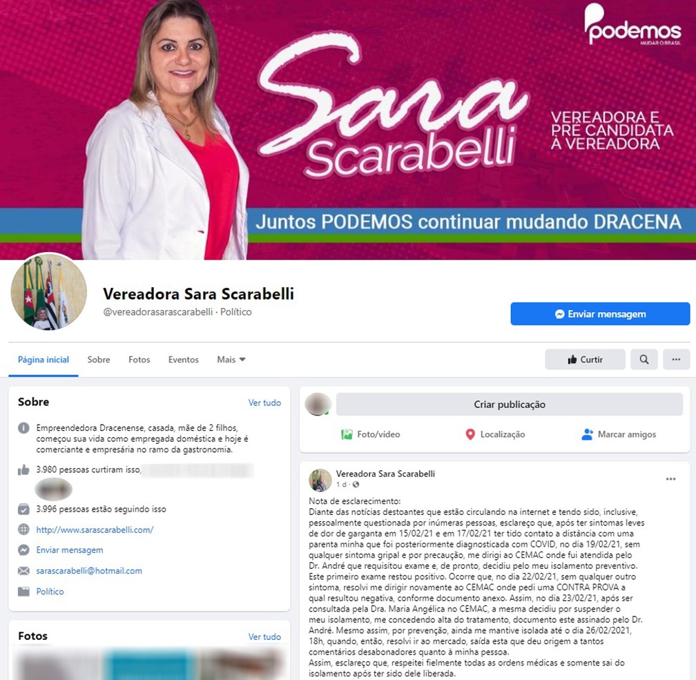 "Diante das notícias destoantes que estão circulando na internet e tendo sido, inclusive, pessoalmente questionada por inúmeras pessoas, esclareço que, após ter sintomas leves de dor de garganta em 15/02/21 e em 17/02/21 ter tido contato a distância com uma parenta minha que foi posteriormente diagnosticada com COVID, no dia 19/02/21, sem qualquer sintoma gripal e por precaução, me dirigi ao CEMAC onde fui atendida pelo Dr. André que requisitou exame e, de pronto, decidiu pelo meu isolamento preventivo. Este primeiro exame restou positivo".